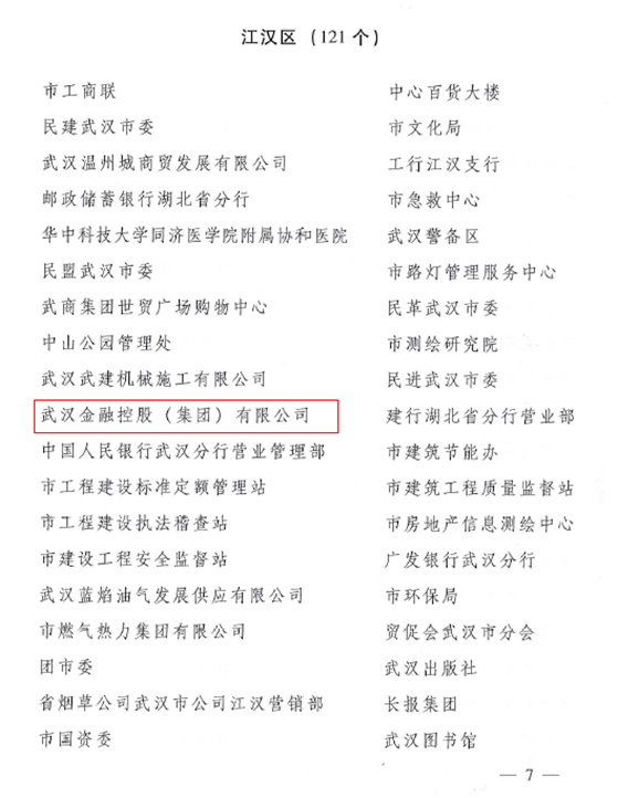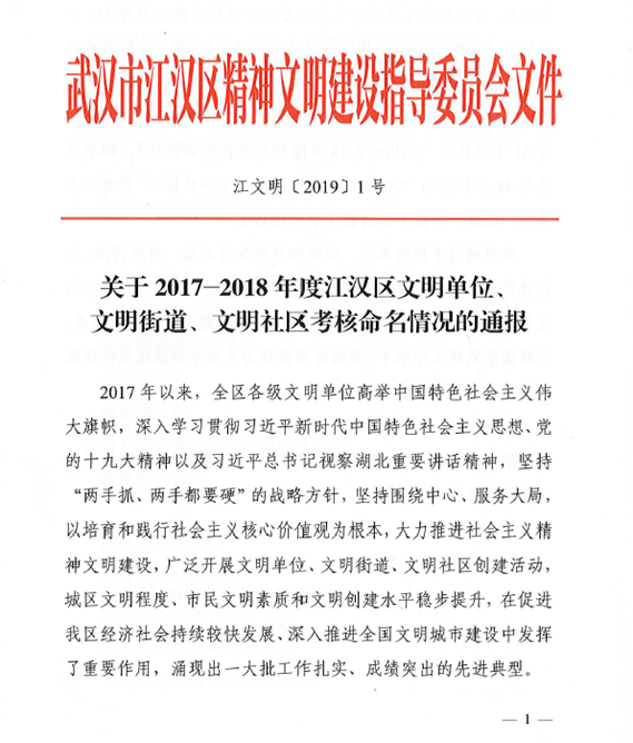 日前,中共武汉市委、武汉市人民政府命名表彰2017—2018年度市级文明单位、文明街道(乡镇)、文明社区(村),集团公司获评“2017—2018年度市级文明单位”。同时,集团公司还被江汉区精神文明建设指导委员会命名为 “2017—2018年度区级最佳文明单位”。
