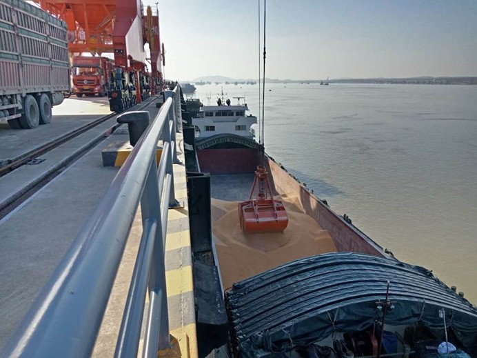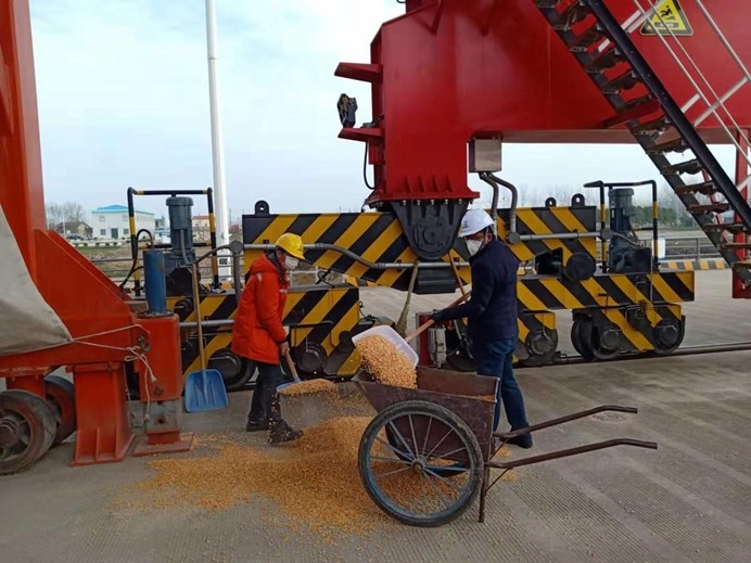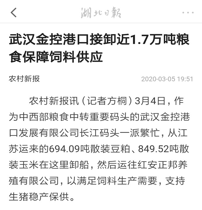 3月4日,作为中西部粮食中转重要码头的bv伟德国际体育官方网站港口发展有限公司长江码头一派繁忙,从江苏运来的694.09吨散装豆粕、849.52吨散装玉米在这里卸船,然后运往红安正邦养殖有限公司,以满足饲料生产需要,支持生猪稳产保供。