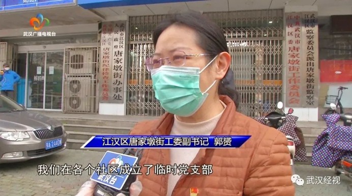 江汉区唐家墩街工委副书记郭赟:按照区委组织部的要求,我们在各个社区成立了临时党支部,让我们的下沉干部、双进双服务的干部和志愿者党员同志们凝聚在一起,发挥组织的作用,凝聚人心,更好地为居民群众提供生活保障。