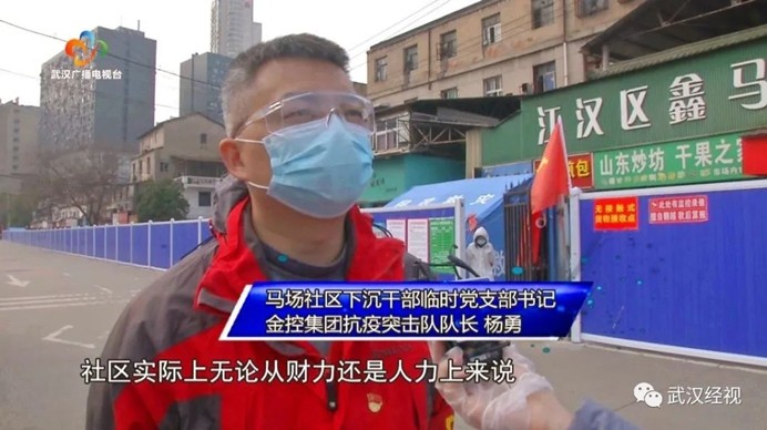 马场社区下沉干部临时党支部书记、金控集团抗疫突击队队长杨勇:社区实际上无论从财力还是人力上来说都是非常有限的,在疫情当前的时候很多短板都凸显出来。我们来自不同的单位,我们的资源可能更广泛一些,这样可以帮助社区解决当前疫期的更多特别问题。