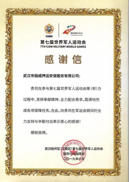 集团旗下融威押运承担了军运会主会场“一场两馆”安保,以及赛事枪支押运、奖牌押运、特卫犬服务等任务,军运会期间累计出勤120天,出勤3.6万余人次,累计安检15万余人次、车辆1万余台次,安全运送奖牌2745块、奖杯50个,多次协助警方、场馆方处理安全事件,高质高效完成各项安保任务,确保了场馆绝对安全、万无一失,专业精神受到各方认可,中央电视台进行了专题跟踪报告,军运会执委会专文发送了感谢信。