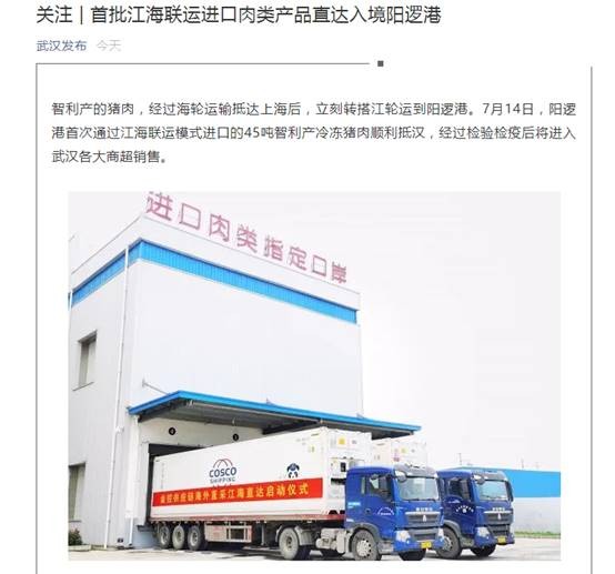 5月底头程配载中远海运“QURE”(库拉轮)从智利圣安东尼奥港口始发,通过江海联运经上海洋山港于近日直达武汉新港阳逻港进口指定肉类口岸,直接在阳逻港口岸完成查验清关入库。