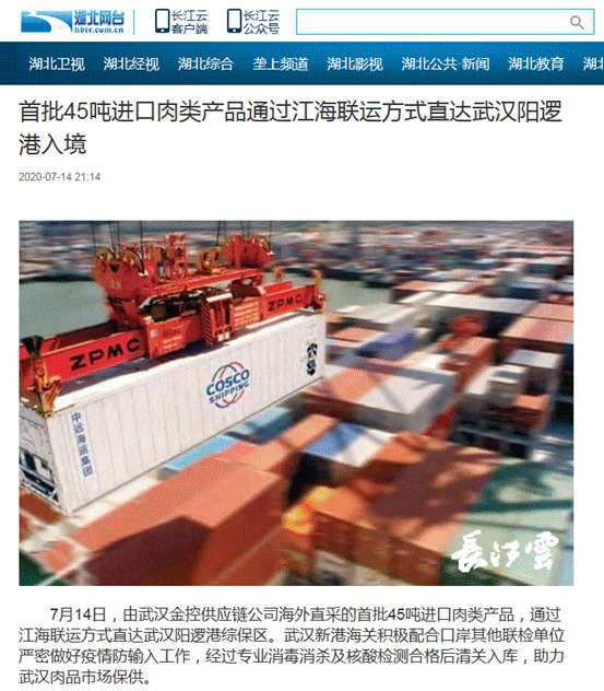 7月14日,由bv伟德国际体育官方网站供应链公司海外直采的首批45吨进口肉类产品,通过江海联运方式直达武汉阳逻港综保区。武汉新港海关积极配合口岸其他联检单位严密做好疫情防输入工作,经过专业消毒消杀及核酸检测合格后清关入库,助力武汉肉品市场保供。