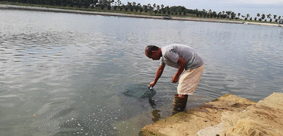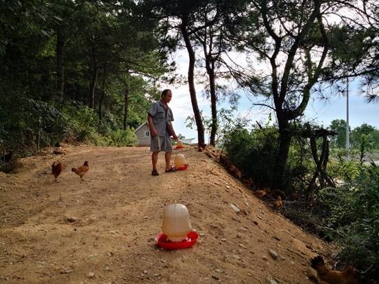 水塘边的小坡上,是村民龚志力创办的“志力合作社”,龚志力正在鱼塘网鱼,工作队提供的1万余尾“先锋1号”鲌鱼(大白刁)已经开钓。除了鱼塘,合作社养有5千只土鸡,由武汉市农科院提供物资和技术、资金支持。“村里两个贫困户负责喂鸡,这些土鸡每只售价100元,到时候按只和他们(贫困户)四六分成。”龚志力说。