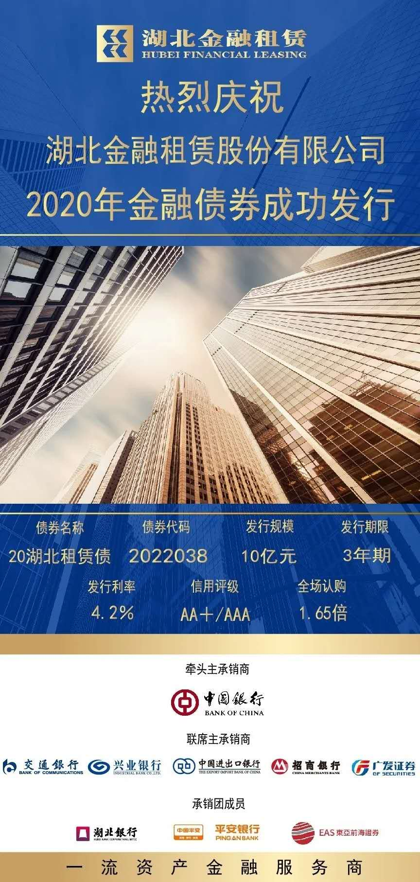 本次发行债券为“2020年湖北金融租赁股份有限公司金融债券(第一期)”,主体评级为“AA+”,债项评级为“AAA”,发行规模为10亿元,期限为3年,票面利率4.2%,全场认购1.65倍。金融债成功发行体现了银行、证券、信托、基金公司等金融机构对公司经营发展的充分认可。本次发行金融债,公司进一步优化负债结构,降低融资成本,提升了行业影响力和服务实体经济能力,为实现新一轮高质量发展筑牢了基础。