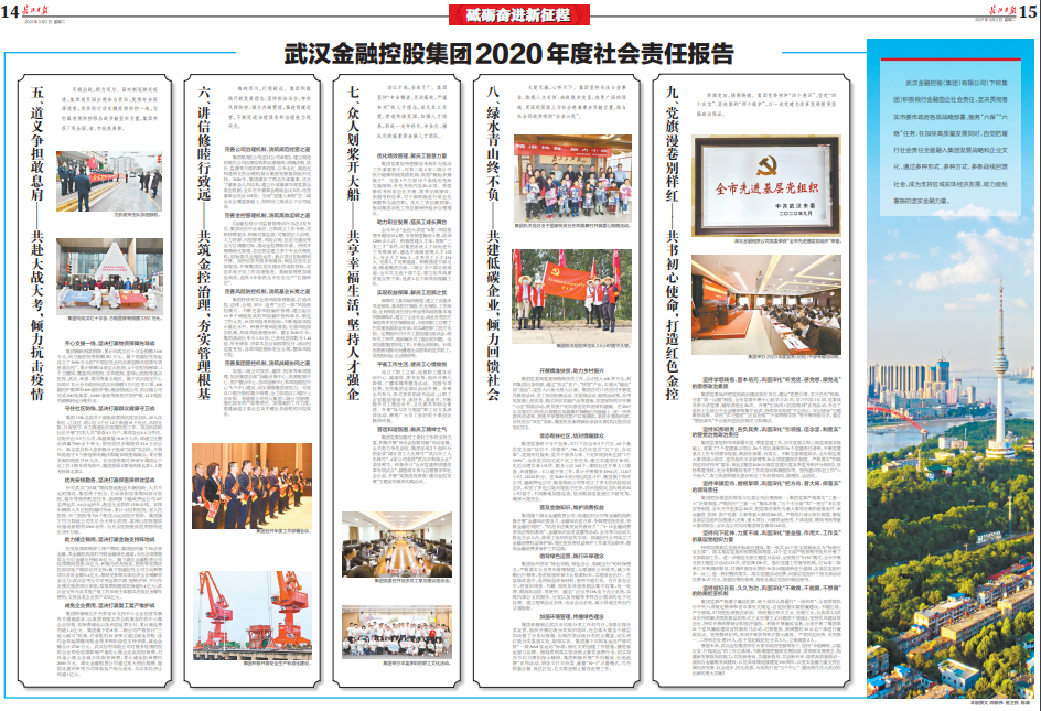 武汉金融控股(集团)有限公司(下称集团)积极践行金融国企社会责任,坚决贯彻落实市委市政府各项战略部署,服务“六保”“六稳”任务,在加快高质量发展同时,自觉把履行社会责任全面融入集团发展战略和企业文化,通过多种形式、多种方式、多条战线回馈社会,成为支持区域实体经济发展、助力疫后重振的坚实金融力量。