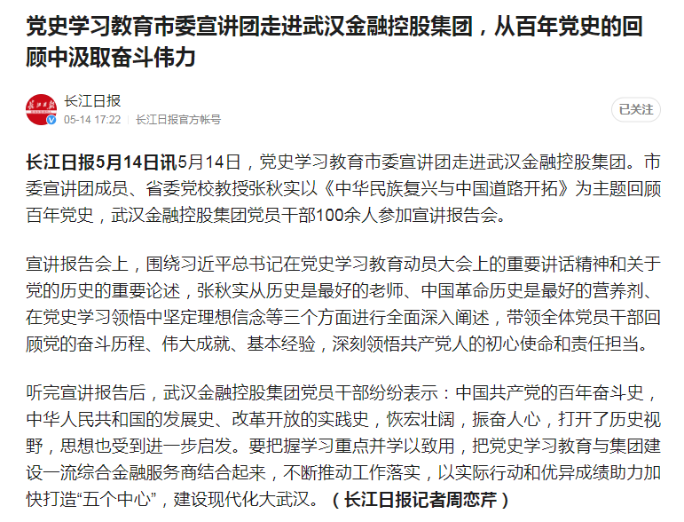 5月14日,党史学习教育市委宣讲团走进武汉金融控股集团。市委宣讲团成员、省委党校教授张秋实以《中华民族复兴与中国道路开拓》为主题回顾百年党史,武汉金融控股集团党员干部100余人参加宣讲报告会。