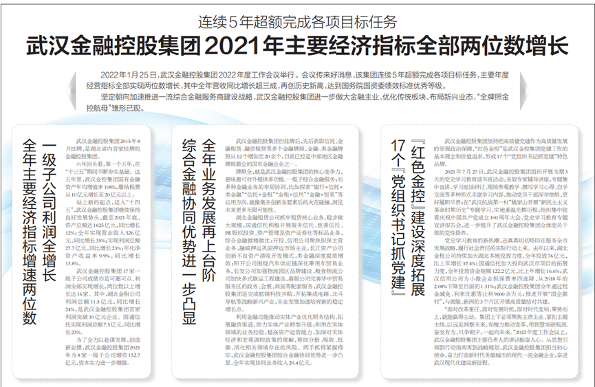 2022年1月25日,武汉金融控股集团2022年度工作会议举行。会议传来好消息,该集团连续5年超额完成各项目标任务,主要年度经营指标全部实现两位数增长,其中全年营收同比增长超三成,再创历史新高,达到国务院国资委绩效标准优秀等级。