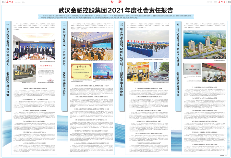 2021年,在武汉市委市政府坚强领导下,bv伟德国际体育官方网站集团围绕主责主业,着力推动“优质资产证券化、经营机制市场化、薪酬考核专业化、风险防控计量化”,加快推动盈利能力、资产质量、管理水平等实现新提升,整体竞争力、创新力、影响力和抗风险能力进一步增强。