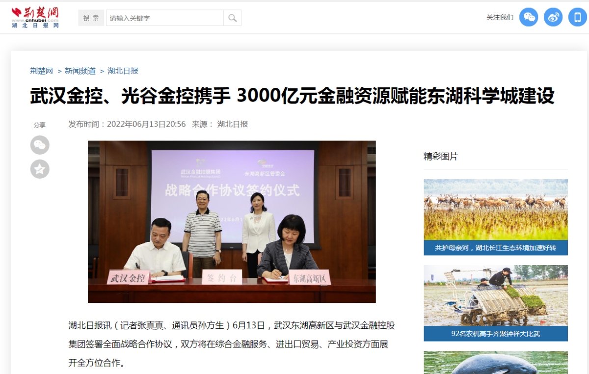 6月13日,武汉东湖高新区与武汉金融控股集团签署全面战略合作协议,双方将在综合金融服务、进出口贸易、产业投资方面展开全方位合作。