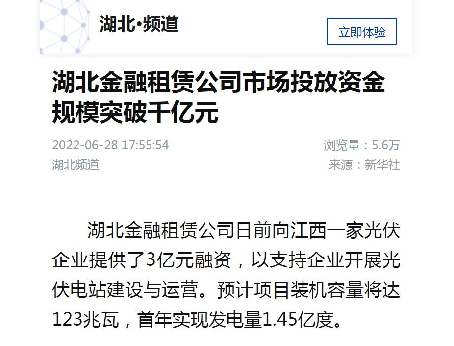湖北金融租赁公司日前向江西一家光伏企业提供了3亿元融资,以支持企业开展光伏电站建设与运营。预计项目装机容量将达123兆瓦,首年实现发电量1.45亿度。