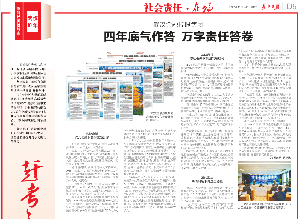 从思想自觉到行动自觉,武汉金融控股集团坚定扛起社会责任,模范践行社会责任,以责任作答,交出有底气的答卷。