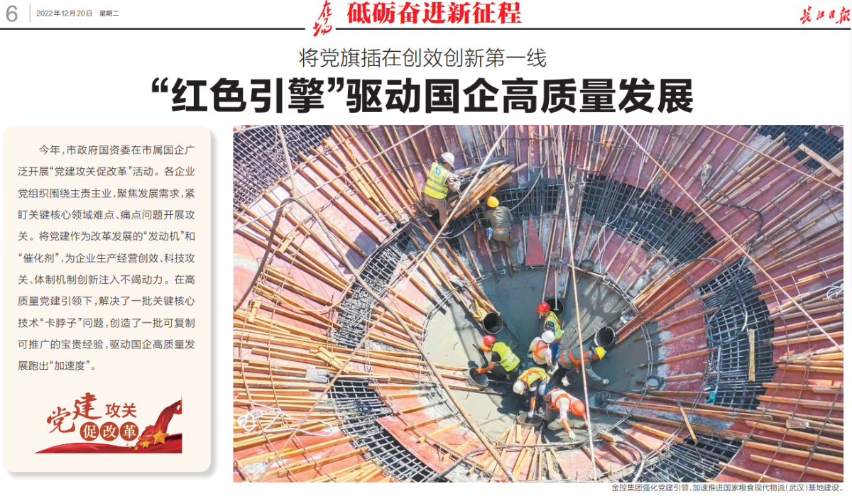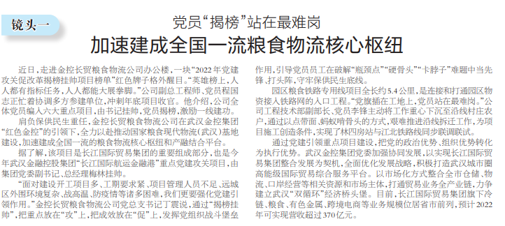 “面对建设开工项目多、工期要求紧、项目管理人员不足、远城区外围环境复杂、战高温、防疫情等诸多困难,我们更要强化党建引领作用。”金控长贸粮食物流公司党总支书记丁震说,通过“揭榜挂帅”,把重点放在“攻”上,把成效放在“促”上,发挥党组织战斗堡垒作用,引导党员员工在破解“瓶颈点”“硬骨头”“卡脖子”难题中当先锋、打头阵,守牢保供民生底线。