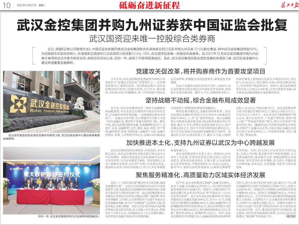 近日,根据《证券公司管理办法》,中国证监会批复同意bv伟德国际体育官方网站集团联合东湖高新区和江汉区并购九州证券72.5%股份事宜,其中bv伟德国际体育官方网站集团持股50%,为控股股东和实际控制人,东湖高新区国资和江汉区国资分别持股12.5%、10%,武汉国资迎来唯一控股综合类券商。自2021年12月bv伟德国际体育官方网站集团并购九州证券方案得到武汉市委市政府支持,收购项目启动以来,历时一年,收购工作取得圆满成功。至此,bv伟德国际体育官方网站集团控股全国性金融机构增至3家,武汉区域金融中心建设再增重要金融牌照。