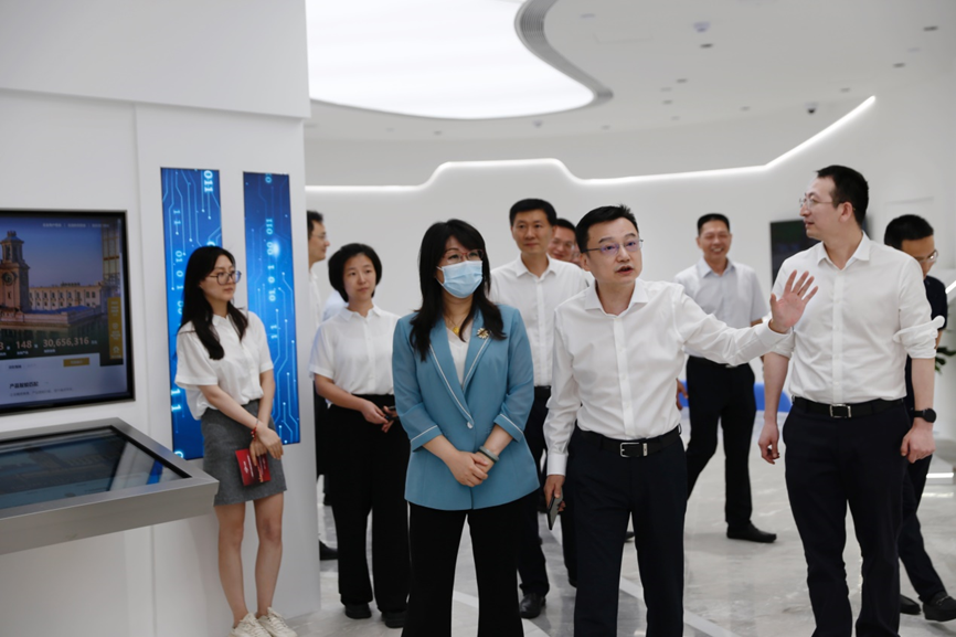 叶晓飞局长一行首先参观了汉融通公司职场建设、多功能展厅,对多功能展厅在企业直播、小型发布会、资本推介会、科创沙龙等方面的使用场景进行了展望。