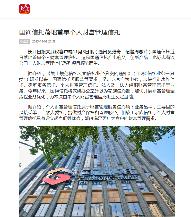 国通信托近日落地首单个人财富管理信托,这是国通信托推出的又一创新产品,也标志着该公司个人财富管理信托系列项目顺势而生。