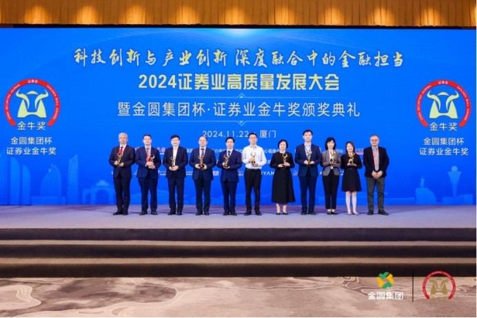 11月22日,由中国证券报、新华社福建分社主办的2024证券业高质量发展大会暨金圆集团杯·证券业金牛奖颁奖典礼在福建厦门举行。会上揭晓了2024证券公司金牛奖、第十五届证券业分析师金牛奖、2024证券公司集合资产管理计划金牛奖榜单。其中,华源证券荣获2024证券公司金牛奖“文化建设金牛奖”,华源证券研究所荣获2024证券业分析师金牛奖“最具潜力研究机构”。