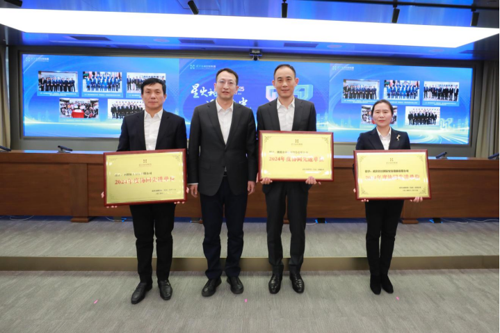 会议现场表彰了湖北金租、华源证券、长江国贸三家“2024年度协同先进单位”,播放了集团十大优秀协同案例短片。