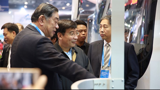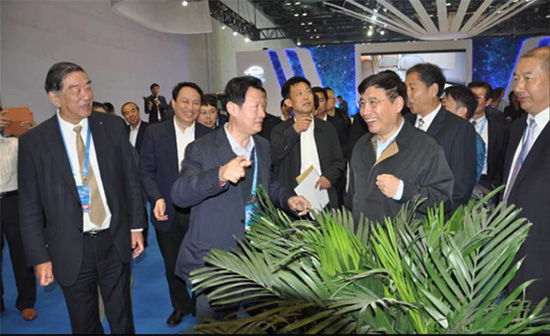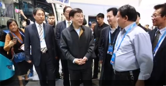 图一:10月14日下午4点,北京奥运村国家会展中心大厅里灯火辉煌。工信部部长苗圩一行兴致勃勃地来到东湖新能源汽车展台,听取武汉金融控股集团董事长马小援关于东湖产业基金投资情况和东湖新能源汽车集团创业情况汇报。