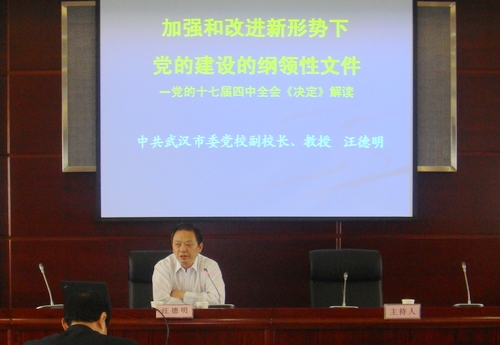 2009年10月16日,市委党校副校长、市行政学院副院长、教授汪德明应邀到集团作《学习贯彻党的十七届四中全会精神》专题讲座。